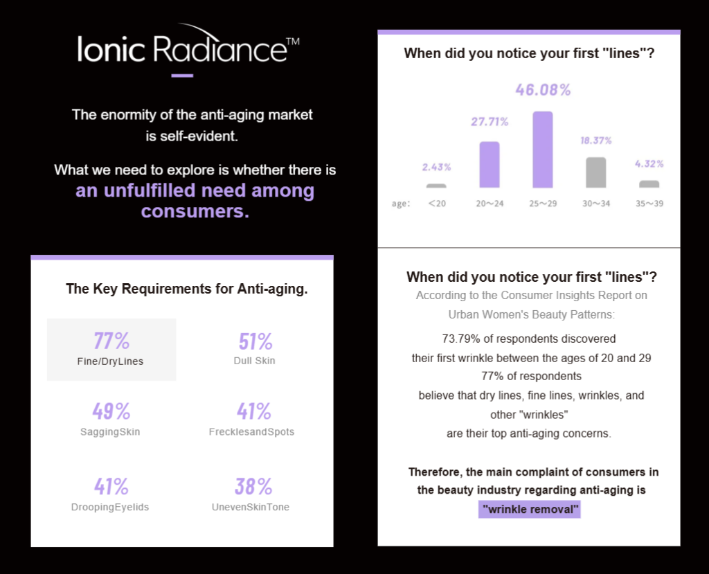 - 77% believe dry lines, fine lines, wrinkles, and other “wrinkles” are their top anti-aging concern